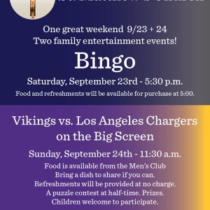 One great weekend September 23-24: Two family entertainment events! Bingo Saturday, September 23rd - 5:30 p.m. Food and refreshments will be available for purchase at 5:00. Vikings vs. Los Angeles Chargers on the Big Screen Sunday, September 24th - 11:30 a.m. Food is available from the Men’s Club. Bring a dish to share if you can. Refreshments will be provided at no charge. A puzzle contest at half-time. Prizes. Children welcome to participate. St. Matthew’s Social Hall, 510 Hall Avenue, St. Paul. Entrance for events is through door 5 in school parking … [Read more...] about Bingo and Football, Feast of St Matthew, September 23-24, 2023