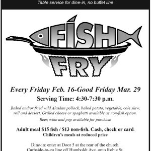 34th Annual Fish Fry Fridays St. Matthew’s Social Hall 510 Hall Ave., St. Paul, MN 55107 Every Friday February 24 through April 7 Serving Time: 4:30 - 7:30 p.m. Both dine-in and curbside pick-up options are available. Baked and/or fried fish, baked potato, vegetable, cole slaw, roll and brownie. Grilled cheese or spaghetti available as non-fish option. Beer and wine available. Adult meal $15 fish / $13 non-fish. Cash or card. Children’s meals at reduced price Enter social hall entrance at the rear of the church. Enter curbside-to-go line off Humboldt Ave. onto Robie St. To … [Read more...] about Fish Fry Fridays: February 24 – April 7, 2023