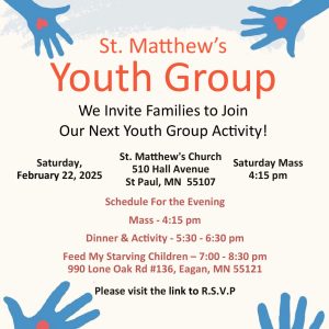 We Invite Families to Join Our Next Youth Group Activity! St. Matthew's Church 510 Hall Avenue St Paul, MN 55107 Saturday, February 22, 2025 Schedule For the Evening Mass - 4:15 pm Dinner & Activity - 5:30 - 6:30 pm Feed My Starving Children – 7:00 - 8:30 pm 990 Lone Oak Rd #136, Eagan, MN 55121 Download the flyer to R.S.V.P. – Youth group flyer February 2025 … [Read more...] about St. Matthew’s Youth Group Activity Saturday, February 22, 2025