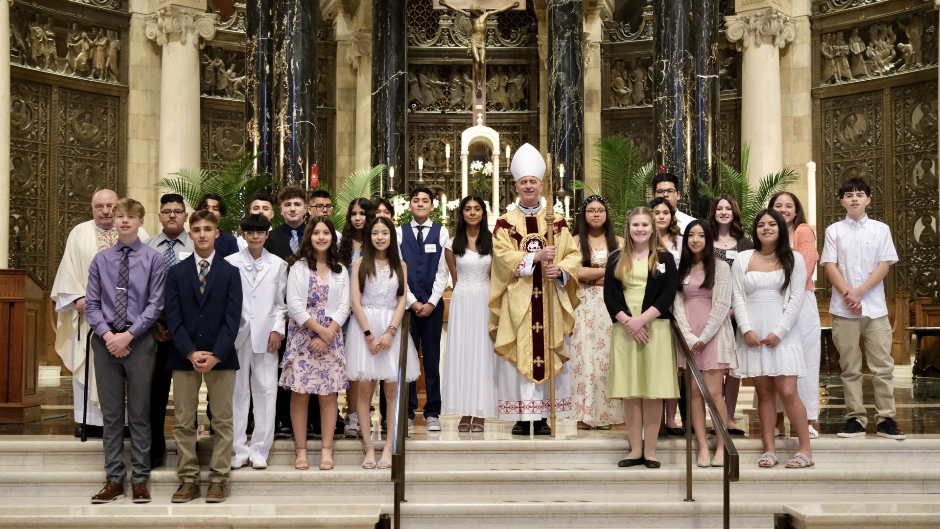 Bishop Joseph Williams and Reverend Steve Adrian at the Cathedral of Saint Paul on April 23 with 23 newly confirmed students from the Church of St Matthew. Twelve of the students are in the St Matthew Faith Formation program, and eleven of the students attend Community of Saints Regional Catholic School. May our students profit from Bishop Williams’ advice that they use the gifts of the Holy Spirit in their lives right away. Congratulations, families!