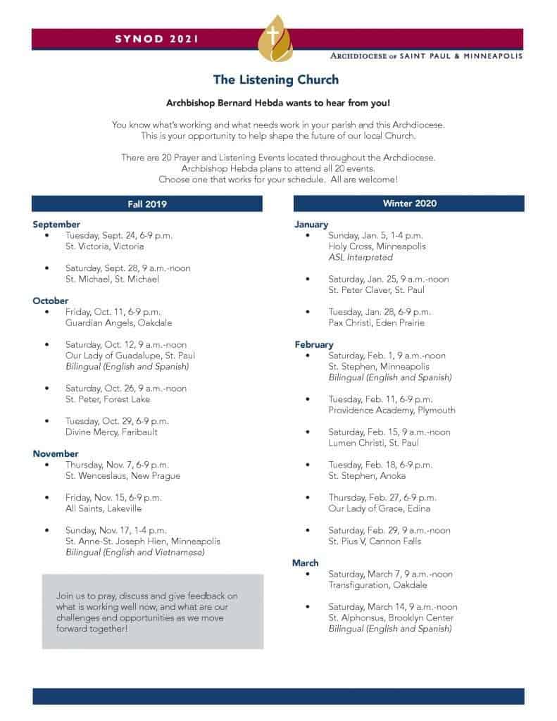 - Archbishop Bernard Hebda is scheduled to attend all events to pray and to participate in the listening process.
