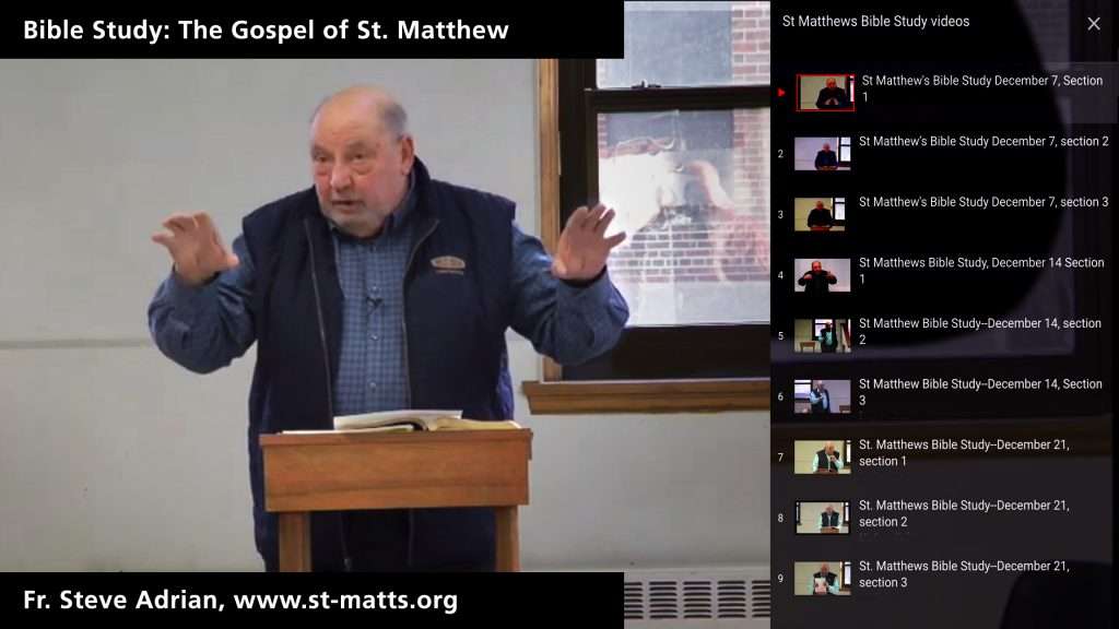 Father Steve Adrian’s continuing bible study sessions exploring the Gospel of Matthew, previously scheduled for March 21 and 28, are POSTPONED. Please check back after April 1 for rescheduled times.