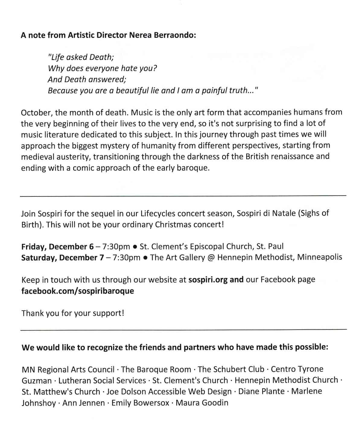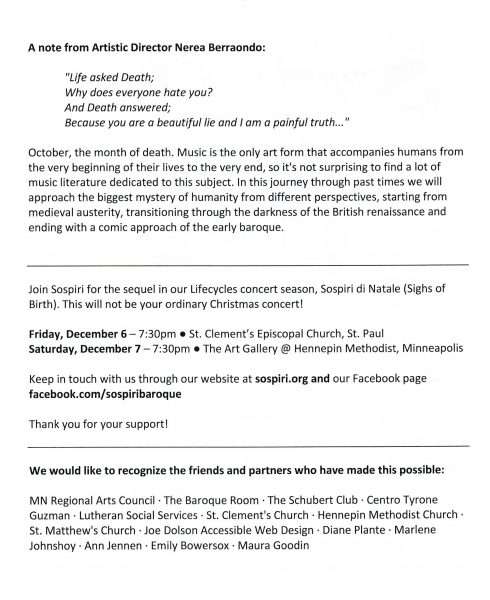 Sospiri da Morte is an exploration of 17th century musical expressions of death and loss from around the world. From plaintive laments to jaunty ciacconas, Sospiri will present many views of death, from Seicento Italy, Spain, and Latin America. The program includes works by Romero, Sances, Landi, Monteverdi, Strozzi, Marini, and more.